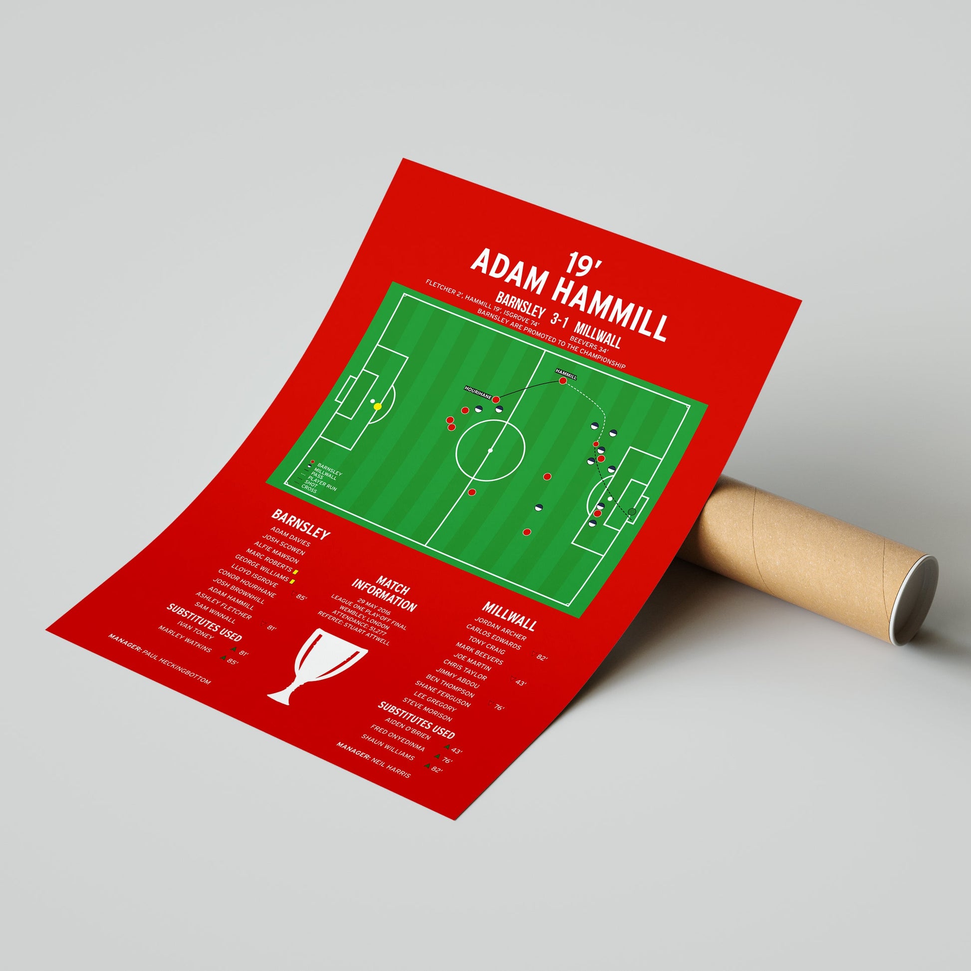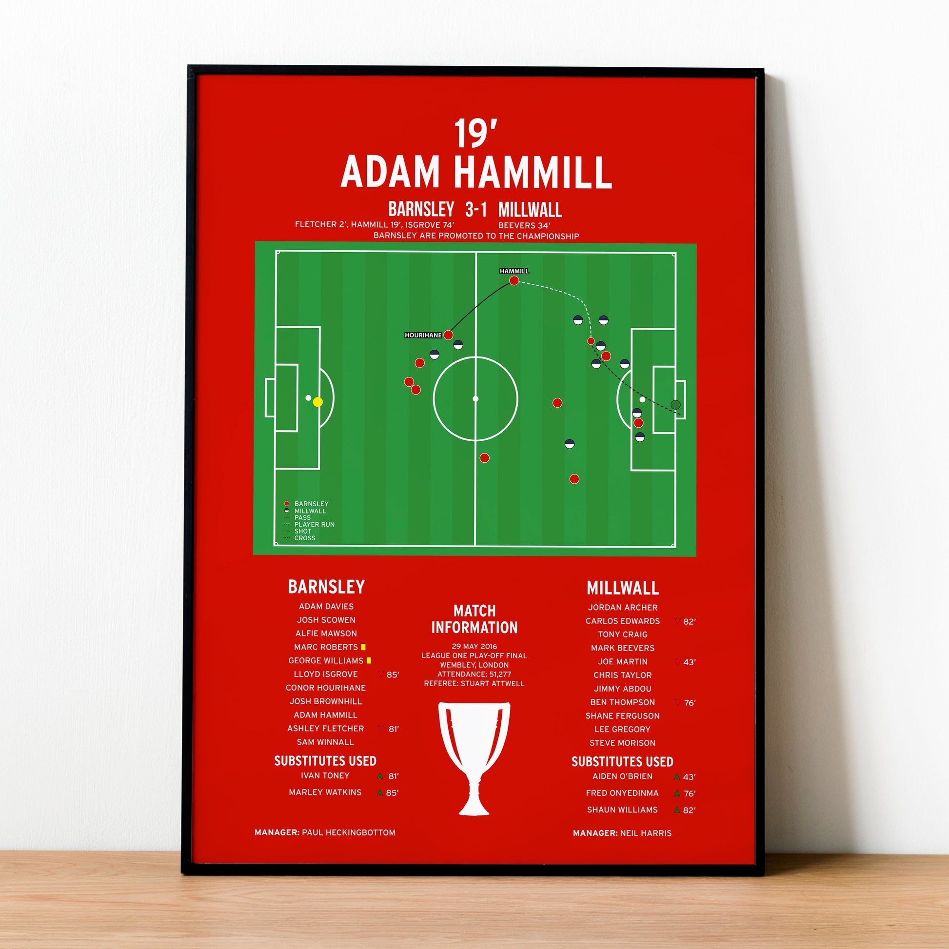 This print showcases Adam Hammill's stunning long-range goal that helped Barnsley seal promotion to the Championship in 2016.