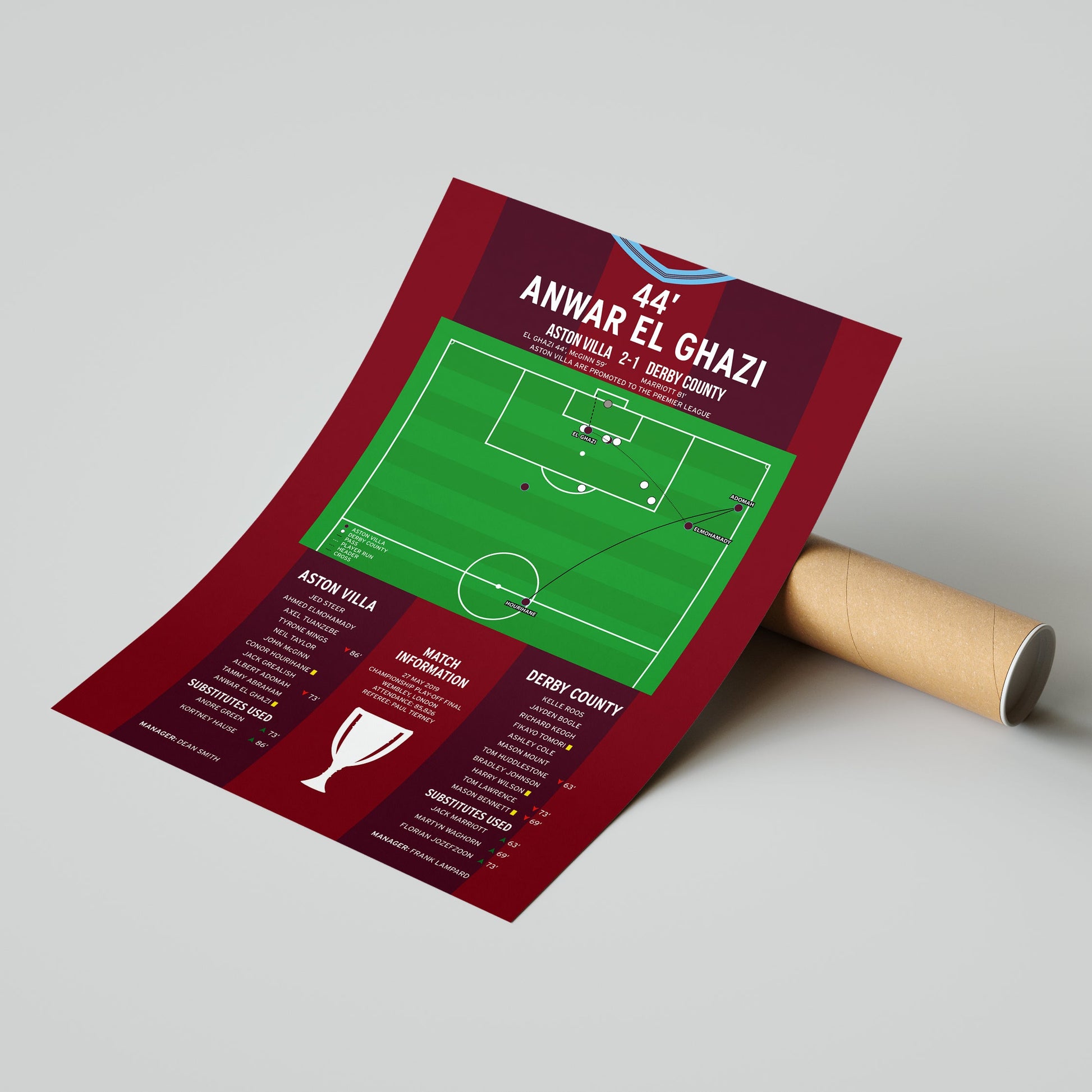 This print showcases Anwar El Ghazi's diving header that helped Aston Villa seal promotion to the Premier League in the 2019 Championship play-off final.