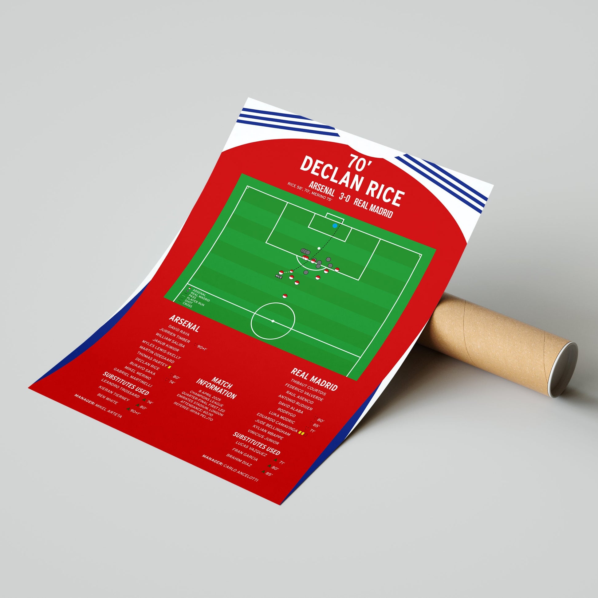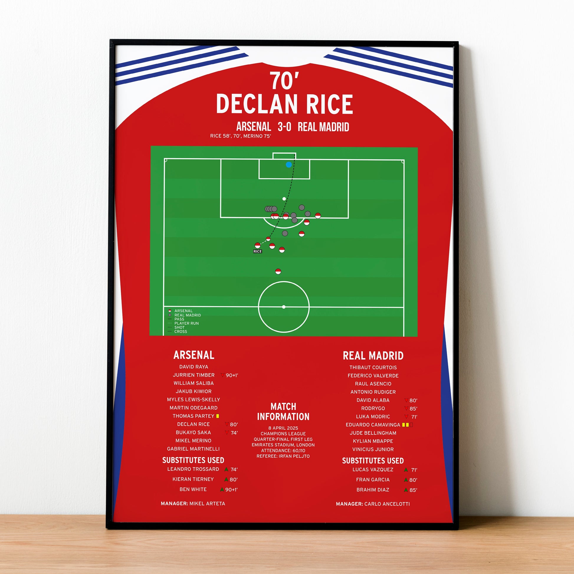This print showcases Declan Rice's second goal as Arsenal stunned Real Madrid in the 2025 Champions League quarter-finals.