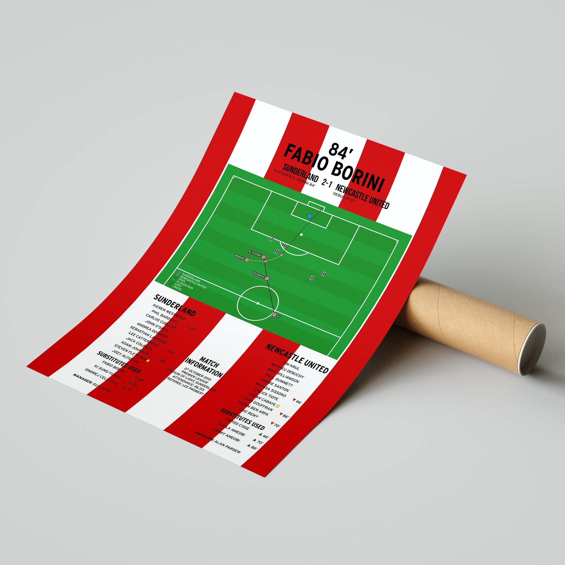 This print showcases Fabio Borini's stunning goal that saw Sunderland beat Newcastle in 2013.