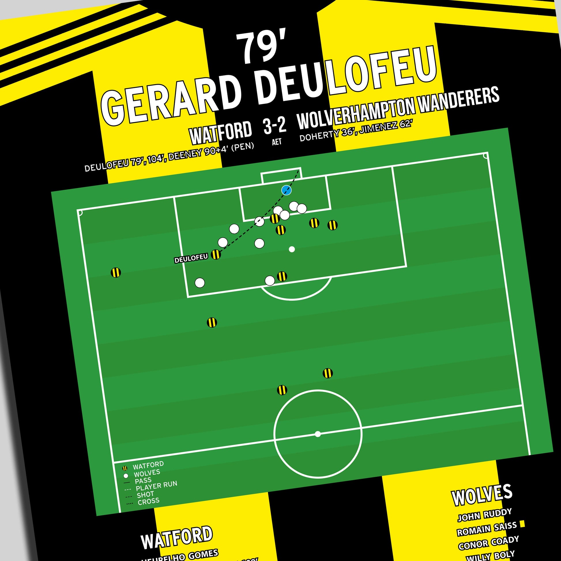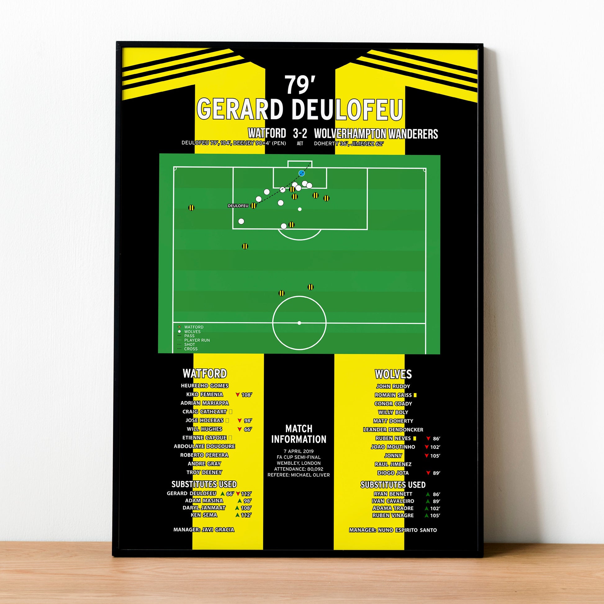 This print showcases Gerard Deulofeu's first goal as Watford beat Wolves in the 2019 FA Cup semi-finals.