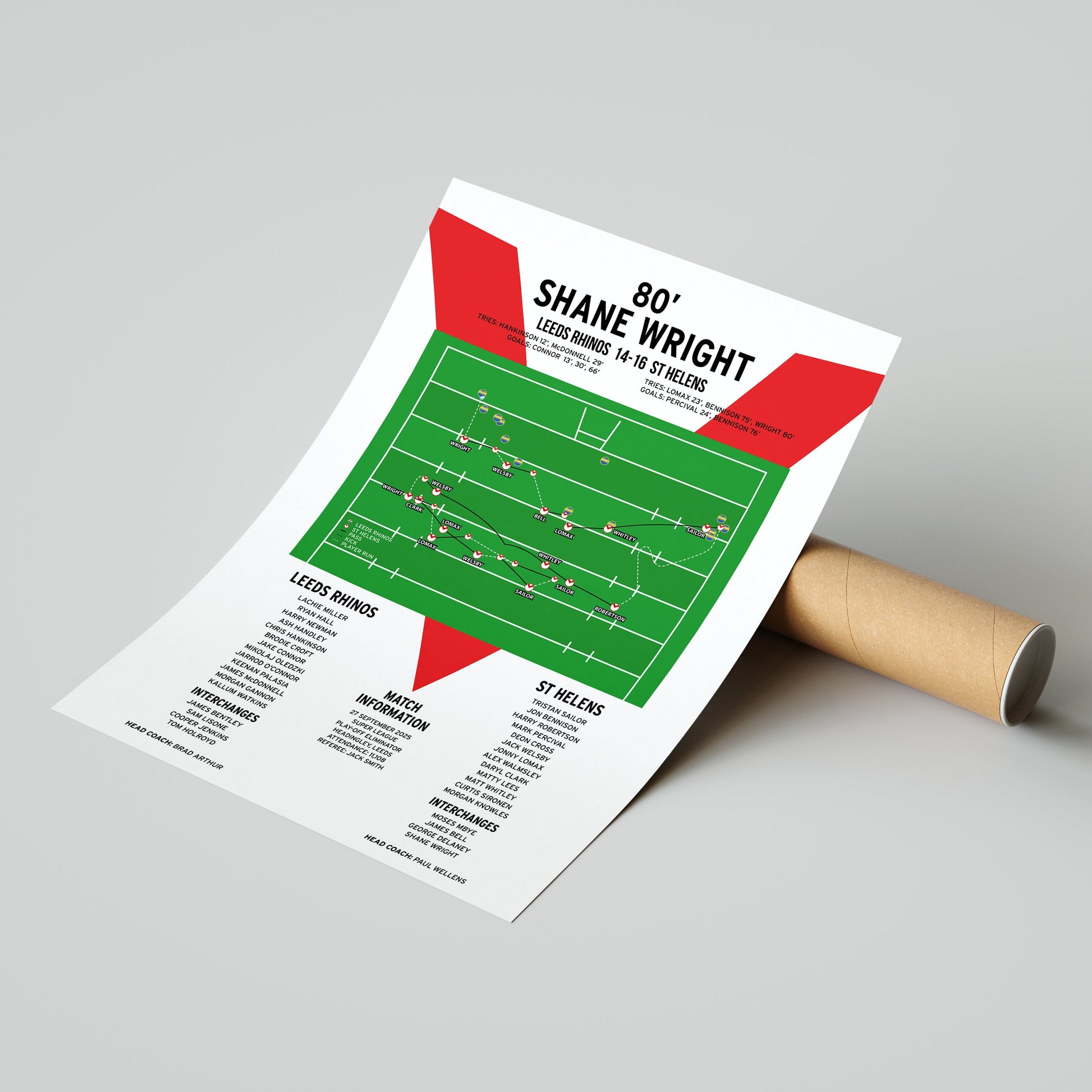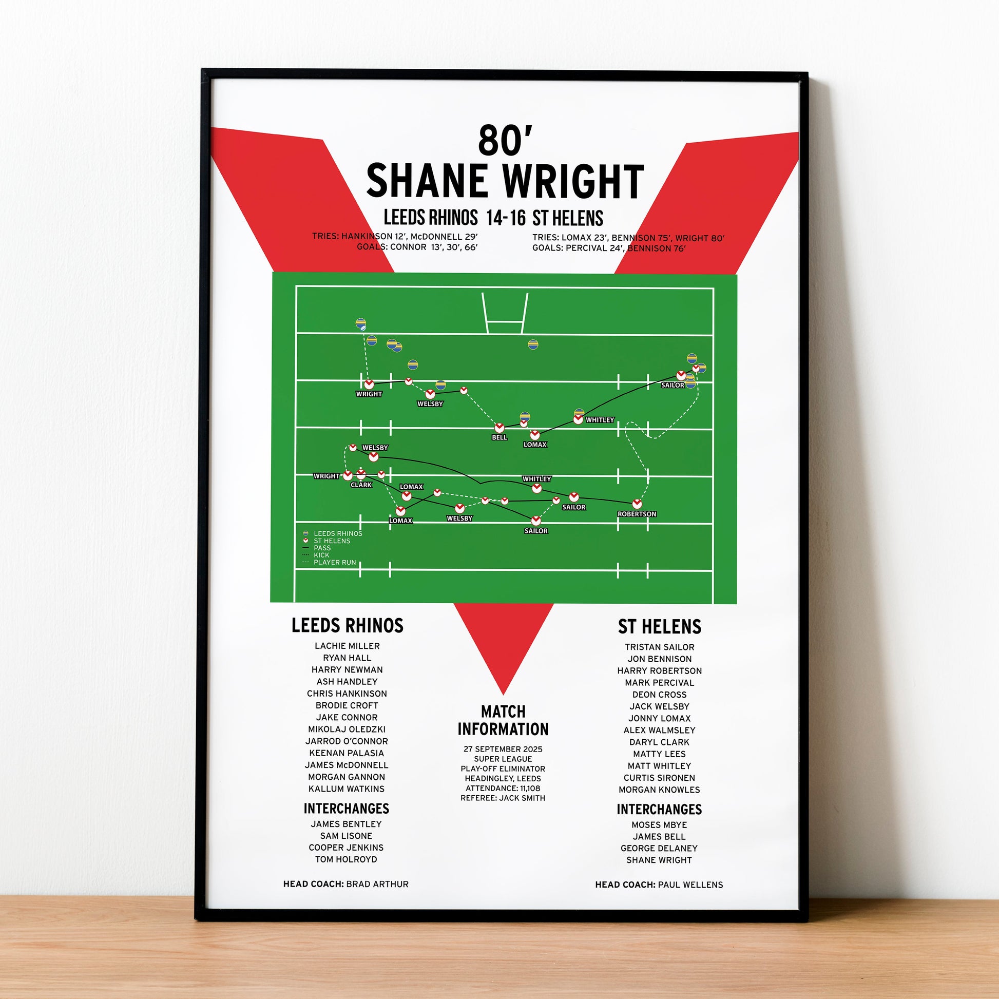 This print showcases Shane Wright's dramatic try that saw St Helens stun Leeds Rhinos in the 2025 Super League Play-Off eliminator.
