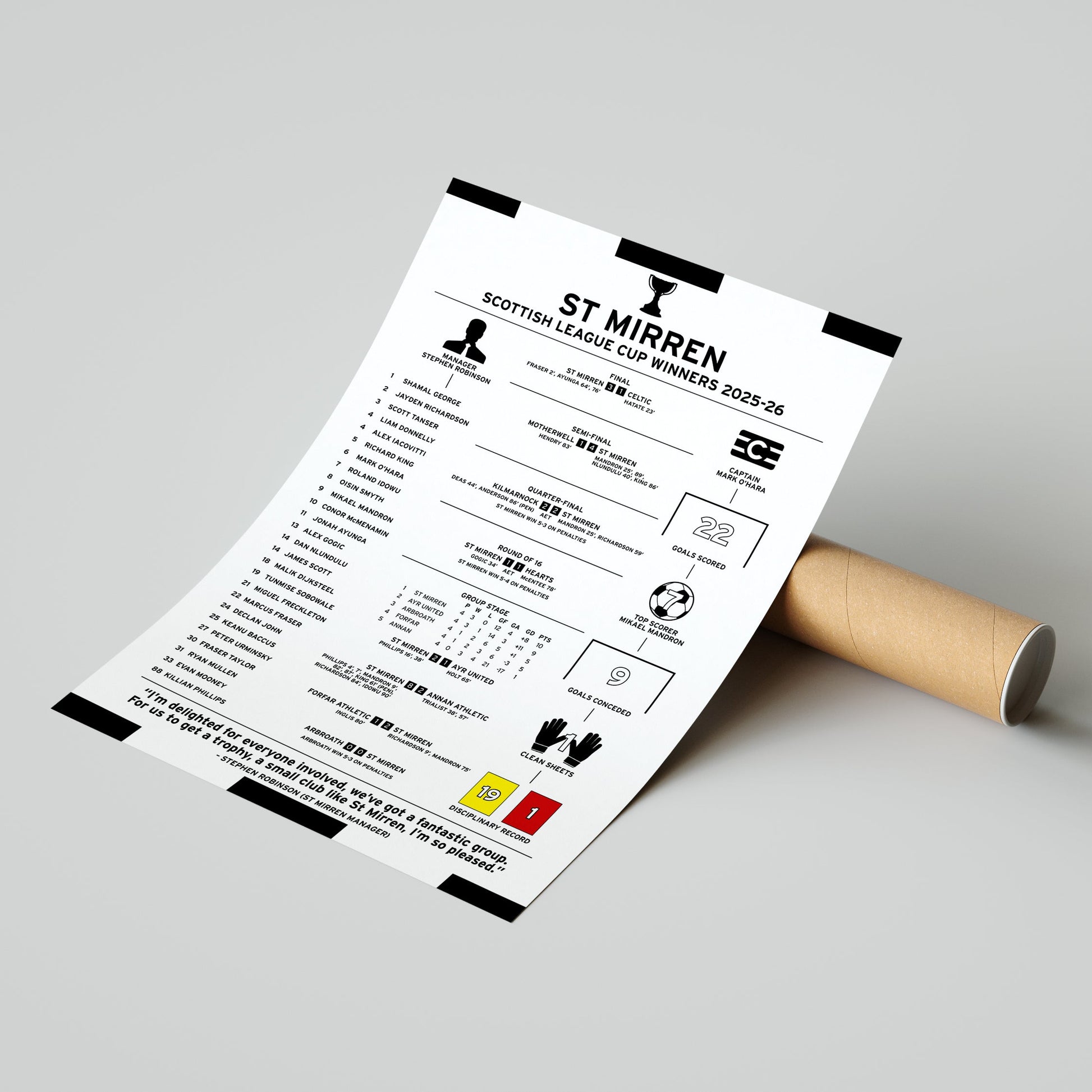 This print showcases St Mirren's Scottish League Cup-winning campaign in the 2025-26 season.