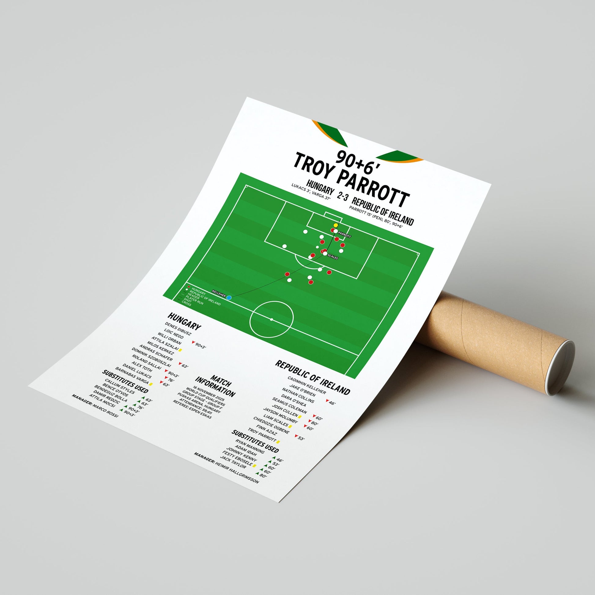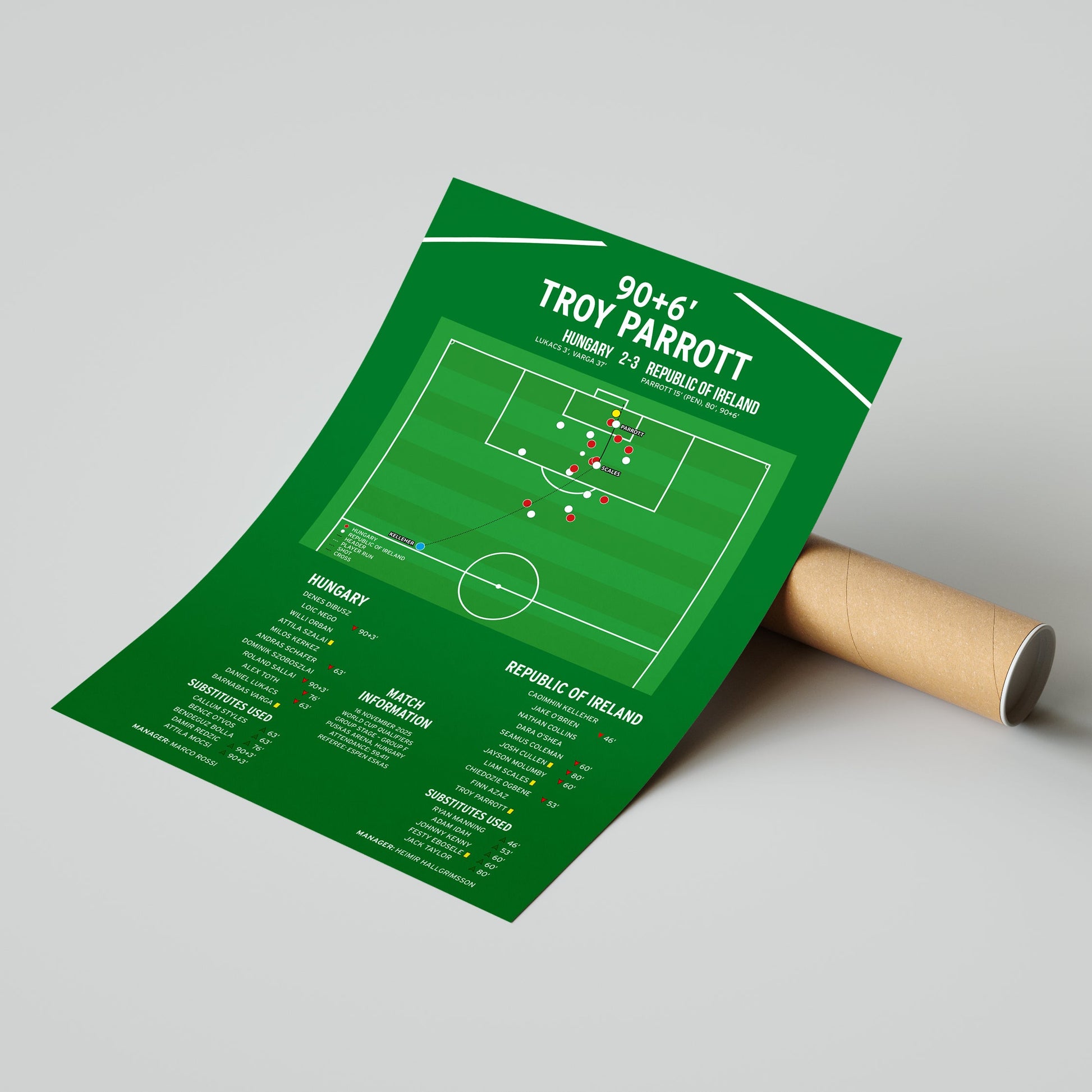 This print showcases Troy Parrott's last-gasp third goal that helped the Republic Of Ireland book a World Cup play-off place against Hungary in 2025.