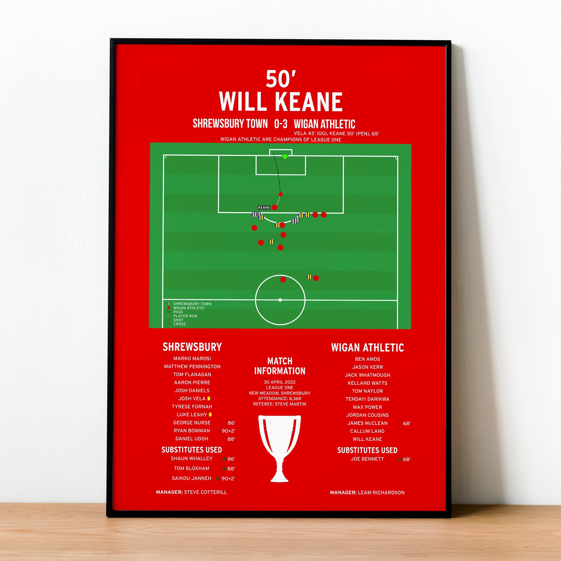 This print showcases Will Keane's penalty against Shrewsbury Town that helped seal Wigan the League One title in 2022.